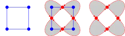 - Pour obtenir l'un des deux graphes G dont H est le médial, colorier les faces de H avec deux couleurs, ce qui est possible puisque H est eulérien (et donc le graphe dual de H est biparti). Les sommets de G correspondent aux faces d'une couleur donnée. Ces sommets sont reliés par une arête si les faces correspondantes ont un sommet en commun dans H. Notons que l'exécution de cette construction à l'aide des faces de l'autre couleur que la couleur choisie produit le graphe dual de G.
