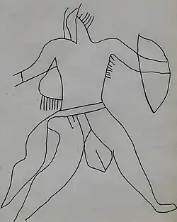 - Le trait de cette gravure est très régulièrement poli. Selon Lhote l'homme paraît porter un casque surmonté d'une coiffure et tient un petit arc à courbure simple. Peut-être est-il vêtu d'un mantelet garni d'effilochures et d'un pagne ou d'une queue postiche. Une figuration apparentée se trouve gravée à la station XXXI.