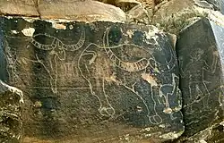 D'autres gravures représentent un bovidé, un rhinocéros, une antilope, un fauve, une autruche.