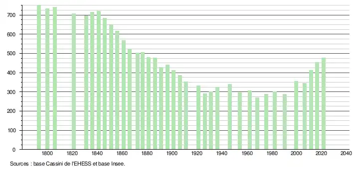 L'évolution du nombre d'habitants est connue à travers les recensements de la population effectués dans la commune depuis 1793. Pour les communes de moins de 10 000 habitants, une enquête de recensement portant sur toute la population est réalisée tous les cinq ans, les populations légales des années intermédiaires étant quant à elles estimées par interpolation ou extrapolation[23]. Pour la commune, le premier recensement exhaustif entrant dans le cadre du nouveau dispositif a été réalisé en 2006[24].