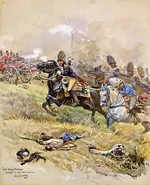 Leur seul engagement a lieu lors de la bataille de Waterloo. Le régiment y est tenu en réserve avec la cavalerie de Kellermann lorsque l'Empereur, afin de soutenir les cuirassiers de Milhaud et la cavalerie légère de la Garde aux prises avec les Anglais sur le Mont-Saint-Jean, décide d'engager la cavalerie lourde de réserve[55],[56]. Les grenadiers à cheval, emmenés par Guyot, chargent à trois reprises les carrés britanniques mais essuient de lourdes pertes parmi lesquels le colonel-major Jean-Baptiste Jamin, tué à la tête de ses hommes par une décharge de mitraille, ainsi que deux lieutenants, Tuefferd et Moreau, et seize autres officiers blessés[43].