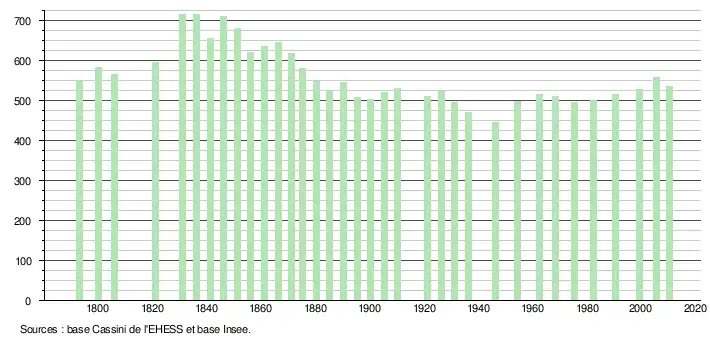 L'évolution du nombre d'habitants est connue à travers les recensements de la population effectués dans la commune depuis 1793. À partir du , les populations légales des communes sont publiées annuellement dans le cadre d'un recensement qui repose désormais sur une collecte d'information annuelle, concernant successivement tous les territoires communaux au cours d'une période de cinq ans. Pour les communes de moins de 10 000 habitants, une enquête de recensement portant sur toute la population est réalisée tous les cinq ans, les populations légales des années intermédiaires étant quant à elles estimées par interpolation ou extrapolation[2]. Pour la commune, le premier recensement exhaustif entrant dans le cadre du nouveau dispositif a été réalisé en 2005[3],[Note 1].