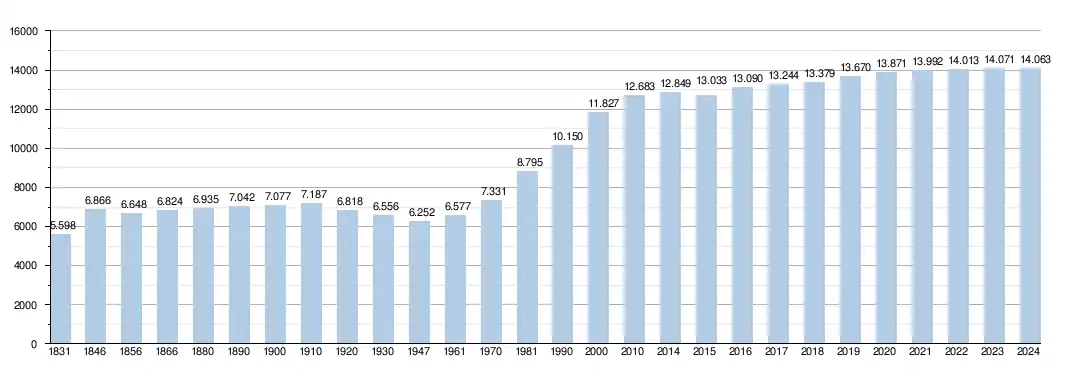 Elle compte, au , 14 077 habitants (6 831 hommes et 7 246 femmes), soit une densité de 253,41 habitants/km²[10] pour une superficie de 55,55 km².