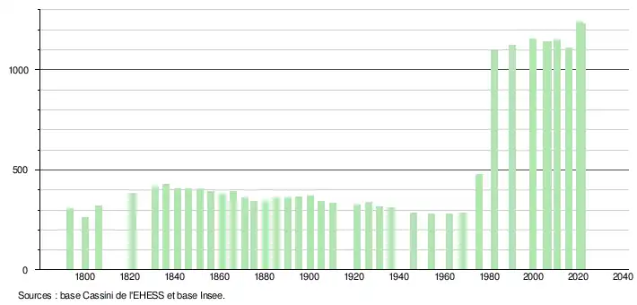 L'évolution du nombre d'habitants est connue à travers les recensements de la population effectués dans la commune depuis 1793. Pour les communes de moins de 10 000 habitants, une enquête de recensement portant sur toute la population est réalisée tous les cinq ans, les populations légales des années intermédiaires étant quant à elles estimées par interpolation ou extrapolation[22]. Pour la commune, le premier recensement exhaustif entrant dans le cadre du nouveau dispositif a été réalisé en 2005[23].