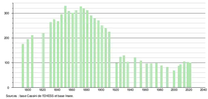 L'évolution du nombre d'habitants est connue à travers les recensements de la population effectués dans la commune depuis 1793. Pour les communes de moins de 10 000 habitants, une enquête de recensement portant sur toute la population est réalisée tous les cinq ans, les populations légales des années intermédiaires étant quant à elles estimées par interpolation ou extrapolation[15]. Pour la commune, le premier recensement exhaustif entrant dans le cadre du nouveau dispositif a été réalisé en 2008[16].