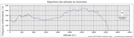 La superficie totale du Groenland est de 2 166 086 km2 (y compris d'autres îles côtières mineures), dont la calotte glaciaire couvre 1 755 637 km2 (soit 81 % du territoire) et a un volume d'environ 2,85 millions de kilomètres cubes[19].