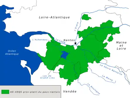L'aire d'appellation se superpose sensiblement à celle du muscadet[3]. Son terroir s'étend sur l’ensemble du vignoble nantais, d’Ancenis à Pornic, avec deux pôles de production plus importants : l'est de la région Sèvre-et-Maine d’une part (Le Loroux-Bottereau et Vallet) et les régions de Logne, Boulogne et d'Herbauges d'autre part avec Corcoué-sur-Logne et Saint-Philbert-de-Grand-Lieu. La zone de prédilection du gros-plant se situe dans le Pays de Retz[12]. Cette zone d'appellation comporte 92 communes, soit 69 communes de la Loire-Atlantique, 16 communes en Maine-et-Loire et 4 communes en Vendée[2].