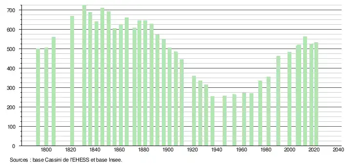 L'évolution du nombre d'habitants est connue à travers les recensements de la population effectués dans la commune depuis 1793. Pour les communes de moins de 10 000 habitants, une enquête de recensement portant sur toute la population est réalisée tous les cinq ans, les populations légales des années intermédiaires étant quant à elles estimées par interpolation ou extrapolation[24]. Pour la commune, le premier recensement exhaustif entrant dans le cadre du nouveau dispositif a été réalisé en 2007[25].