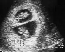- jumeau ou masse acardiaque : il s'agit d'une complication rare (entre 1 sur trente mille et 1 sur quarante mille grossesses), où un jumeau n'a pas de cœur (ou réduit à l'état de vestiges). Le jumeau sain joue le rôle de « pompe cardiaque » pour son jumeau acardiaque. Le diagnostic est échographique. L'évolution peut conduire à la mort et l'involution du jumeau acardiaque, qui peut rester à l'état de « jumeau papyracé » (momifié) ou disparaître (« jumeau fantôme »), sans répercussion notable sur le jumeau sain. Dans d'autres cas, les deux jumeaux peuvent évoluer jusqu'à la naissance, mais la mortalité du jumeau sain est alors élevée (près de 50 %) par insuffisance cardiaque et hypoxie chronique, par le fait que son cœur doit fonctionner pour deux, en recevant du sang désoxygéné deux fois. La prise en charge de cette complication n'est pas codifiée et varie selon les équipes[11].