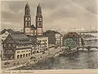 Le Grossmünster et le Quaibrücke, depuis le lac de Zurich.