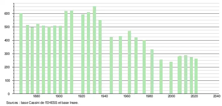 L'évolution du nombre d'habitants est connue à travers les recensements de la population effectués dans la commune depuis 1866. Pour les communes de moins de 10 000 habitants, une enquête de recensement portant sur toute la population est réalisée tous les cinq ans, les populations légales des années intermédiaires étant quant à elles estimées par interpolation ou extrapolation[26]. Pour la commune, le premier recensement exhaustif entrant dans le cadre du nouveau dispositif a été réalisé en 2007[27].