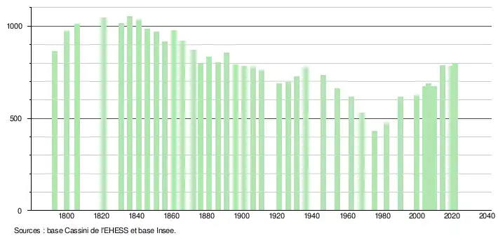 L'évolution du nombre d'habitants est connue à travers les recensements de la population effectués dans la commune depuis 1793. Pour les communes de moins de 10 000 habitants, une enquête de recensement portant sur toute la population est réalisée tous les cinq ans, les populations légales des années intermédiaires étant quant à elles estimées par interpolation ou extrapolation[23]. Pour la commune, le premier recensement exhaustif entrant dans le cadre du nouveau dispositif a été réalisé en 2004[24].