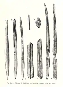 La couche B (Azilien) a livré une phalange unguéale de cheval trouvée par René de Saint-Périer et portant dans les scissures plantaires[n 1], et sur la face inférieure des traces de coups allant en convergeant du bord postérieur au bord antérieur. La couche A (Magdalénien supérieur) de l'abri des Harpons en a livré deux similaires, et 21 des 103 phalanges unguéales de l'abri de la Madeleine (Dordogne) portent les mêmes traces[24].