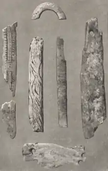 - L'image ci-contre montre une moitié d'anneau en bois de renne (no 1) très régulièrement taillé et poli, un objet rate parmi le mobilier magdalénien ; il est comparable à "la poignée" trouvée à la grotte du Placard, bien que cette dernière soit munie de crans latéraux absents ici. Les peignes inuits en bois de cervidé se terminent par un anneau similaire[21].