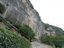 Le bas de l’escalier menant à l'entrée de la grotte (on aperçoit le toit de l'entrée plus haut) Le bas de l’escalier menant à l'entrée de la grotte (on aperçoit le toit de l'entrée plus haut)