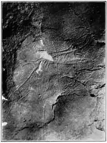 - Au fond s'ouvre une galerie qui mène vers le niveau inférieur, ornée d'un cheval gravé, de tracés indéterminés, et d'un masque anthropomorphe exécuté sur un relief naturel[23].