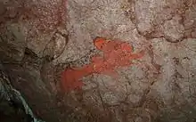 Une autre peinture représente un serpent à plumes rouge avec des plumes vertes, près d'un jaguar rouge avec de grandes oreilles.