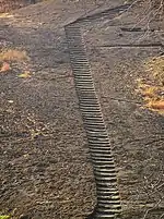 Partout sur la colline, d'un ensemble de grottes à l'autre, des marches sont creusées à la surface de la roche, et ces escaliers disposent, dans de nombreux cas, de rampes sur leurs côtés.
