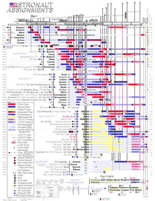 Tableau indiquant les affectations du groupe 3 aux programmes Mercury, Gemini et Apollo, en relation avec les missions des groupes antérieurs 1, 2 et des groupes ultérieurs 4, 5, 6 et 7