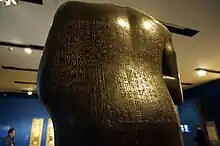 Traduction de l'inscription : « Pour Ningirsu, le héros puissant d'Enlil, son roi, Gudea, l'ensí de Lagash, accomplit ce qui convenait (et) son Eninnu, l'Anzu blanc, il construisit et il le restaura[56]. »
