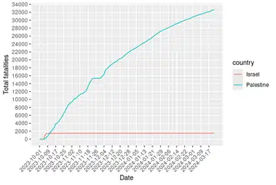 Les bombardements puis les actions des soldats de l'armée israélienne de terre déployés au sol dans Gaza, ont tué plus de 30 000 personnes[39] dont 12 300 enfants et 8 400 femmes. A cela s'ajoute un nombre élevé de blessés : 70 000 personnes[39], en majorité des civils, et au moins 7 000 personnes sont portées disparues.