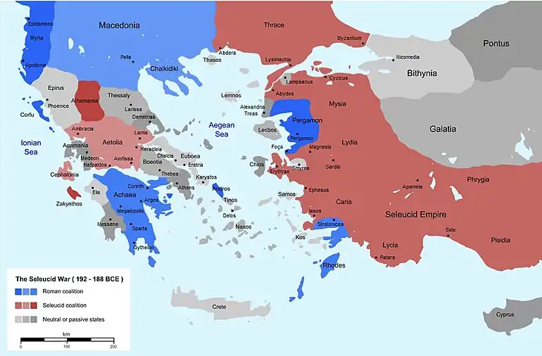 Dans le même temps, le fils d'Antiochos III, Séleucos IV, bientôt rejoint par son père, s'attaque au royaume de Pergame mais échoue à prendre sa capitale. C'est à ce moment qu'Antiochos apprend que les Romains traversent la Macédoine en vue de débarquer en Asie et qu'il entreprend en vain des négociations de paix[20]. Il propose aux Romains d'abandonner ses prétentions sur la Thrace et sur les cités grecques d'Anatolie ; les Romains répondent à cet offre en lui demandant d'évacuer toute l'Anatolie à l'ouest du Taurus. Jugeant ces exigences impossibles à remplir, Antiochos se résout à combattre les Romains, d'autant qu'il a pu monter une armée deux fois plus nombreuse que celle des Romains.