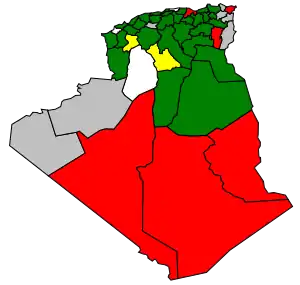 Le , le couvre-feu, de 22h30 à 5 heures du matin est décrété dans sept wilayas : Alger, Tipaza, Boumerdès, Blida, Médéa, Aïn Defla, Bouira[56],[57].
