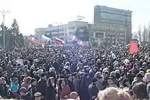 Le , des manifestations pro-russes ont lieu dans les régions russophones du pays, notamment à Kharkiv, Donetsk ou Odessa[123]. Le , 300 manifestants pro-russes ont envahi le bâtiment administratif régional de Donetsk. Le , des manifestations pro-russes ont eu lieu dans les villes industrielles de l'est de l'Ukraine. À Donetsk, des manifestants ont pénétré dans les sièges du parquet et des services spéciaux, à l'issue d'une manifestation de 2 000 personnes en faveur du rattachement à la Russie. À Kharkiv, ce sont 6 000 manifestants qui ont organisé, et ce malgré l'interdiction de la justice, un meeting-référendum pour plus d'autonomie et pour la « souveraineté » de la langue russe. Des milliers d'entre eux ont ensuite marché vers les bureaux d'organisations nationalistes où ils ont brûlé drapeaux, livres et tracts devant l'entrée. Les partisans de Kiev ont de leur côté décidé d'annuler leur manifestation afin d'éviter des provocations après qu'une personne a été poignardée à mort à Donetsk le et que deux personnes ont été tuées dans la nuit du 14 au à Kharkiv lors d'une fusillade impliquant nationalistes radicaux et militants pro-russes[124],[125].