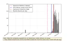 Depuis le début de l'offensive, les Brigades Izz al-Din al-Qassam, le Jihad islamique palestinien et d'autres mouvements ont tiré des centaines de roquettes (surtout des roquettes Qassam ou d'autres roquettes livrées selon Michel Goya par la Syrie et l'Iran)[110]. Une partie des roquettes ont été interceptées par le Dôme de fer mais d'autres ont touché le territoire israélien majoritairement sans faire de victimes. La plupart des roquettes touchent surtout le sud d'Israël mais certaines ont une portée beaucoup plus longue et pourraient toucher des localités située assez loin au nord de Gaza[111] ; certaines ont même atteint des zones proches de l'aéroport de Tel Aviv-Jaffa[112] et des grandes villes du centre et du nord d'Israël. Pendant les trêves, des roquettes ont été tirées depuis Gaza en direction de l'État hébreu[113].