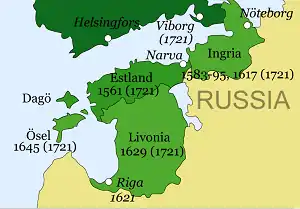 Dès les années 1550, la Suède tente de s'étendre en Livonie, mais en est empêchée par l'intervention du tsar de Russie (guerre russo-suédoise de 1554-1557, conclue par le traité de Novgorod[14].