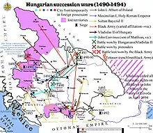 Carte montrant l'intervention des prétendants au trône de Hongrie entre 1490 et 1494.