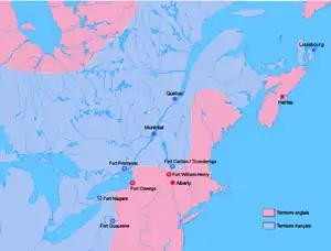D'abord ponctué par une série de succès français lors de ses trois premières années, le conflit ne tarde pas à prendre une ampleur inattendue du fait de l'intensification des opérations en Europe et de la volonté britannique de réduire la présence française en Amérique du Nord. Il est marqué ensuite par l'envoi d'un fort contingent britannique dans les colonies en 1758, le manque de vivres et d'approvisionnement causé par une mauvaise gestion locale, qui provoque la famine de 1757-1758 (cumulant mauvaises récoltes en 1757, malversations de commerçants, accroissement de consommateurs et diminution de producteurs, ces derniers étant aussi mobilisés l'été)[1], le blocus imposé par la Royal Navy (qui devient progressivement maîtresse des mers) aux ports français, et une intensification des opérations militaires de la France en Europe : pour toutes ces causes, la guerre finit par tourner à l'avantage des Britanniques, qui peuvent envahir la Nouvelle-France en 1759.