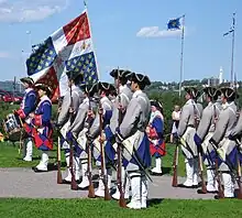 Pour la première fois depuis 1665 (régiment de Carignan-Salières), la France envoie des troupes de l’armée de terre au Canada. Huit bataillons sont prélevés sur six régiments différents[48]. Placés sous le commandement du baron de Dieskau, officier général vétéran des guerres d’Allemagne, ils doivent renforcer les garnisons de Louisbourg, Québec et Montréal. Leur mission est strictement défensive ; tandis que l’infanterie métropolitaine défend les villes fortifiées, les troupes de la colonie doivent pouvoir mener des actions offensives dans l’Ouest. Il n’est pas du tout question, à l’origine, pour les troupes de ligne, d’aller faire une guerre à l’européenne avec des moyens aussi réduits[33].
