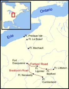 Braddock quitte le Maryland le [75]. Alors qu’il a minutieusement préparé son armée, il commet l’erreur tactique de se lancer à travers les bois avec une colonne de 2 200 hommes alourdie par de l’artillerie et des bagages, exactement comme s’il s'agissait de faire campagne dans les Flandres ou en Allemagne[33]. Il est faiblement soutenu par les colons américains qui n’ont pas été consulté sur les choix opérationnels[77]. Seul Benjamin Franklin, alors directeur des postes de Pennsylvanie, remplit son engagement de fournir cent-cinquante chariots[30]. La lourde colonne avance lentement dans les forêts en traçant une route pour faire passer l’artillerie, ce qui laisse le temps aux éclaireurs de la repérer. En face, Charles de Langlade, Liénard de Beaujeu et Jean-Daniel Dumas rassemblent une troupe franco-amérindienne de 850 hommes[78] détachée depuis Fort Duquesne et qui combattent selon la tactique de la « petite guerre ». Le , ils surprennent les Anglo-Américains sur les rives de la Monongahela et les mettent en déroute après une furieuse bataille. Braddock est tué, 1 500 de ses hommes sont mis hors de combat (blessés ou tués), tandis que tout son bagage (y compris ses archives[79]), toute son artillerie et 400 chevaux tombent entre les mains des Franco-Amérindiens, dont les pertes sont faibles[80]. Les Amérindiens ont joué un rôle essentiel dans cette bataille[81].
