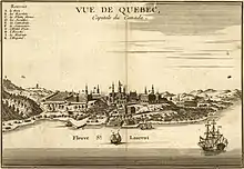 À l’automne 1758, Bougainville, trompant le blocus sur un petit navire corsaire, vient demander des renforts en dressant un portrait très sombre de la situation à Québec[67]. Il repart en avec un petit convoi de vivres et 400 soldats, juste à temps pour participer à la défense de la ville assaillie en par vingt-deux vaisseaux, vingt-deux frégates et soixante-dix bâtiments de charge porteurs d’une armée de 10 000 hommes[68]. Des brûlots sont lancés contre les bâtiments britanniques. En vain. Québec capitule le 18 septembre, après un long siège et une bataille mémorable (voir ci-dessous).