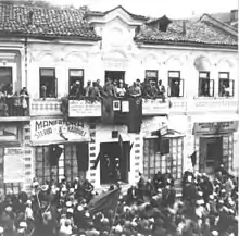 Comités d'action bulgares – Après la défaite de l'armée yougoslave, un groupe de Bulgares macédoniens dirigé par Spiro Kitincev est arrivé en Macédoine et a commencé à préparer l'arrivée de l'armée et de l'administration bulgares en Macédoine[36]. Le premier des comités d'action bulgare a été formé à Skopje le 13 avril 1941. Les anciens membres de l'IMRO[37],[38] de Vardar Macédoine étaient des membres actifs de ce comité. Le 13 avril 1941, lors d'une réunion à Skopje, il fut décidé que l'une des premières tâches de l'organisation nouvellement formée était de régler les relations avec les autorités allemandes[39]. Lorsque l'armée bulgare est entrée en Macédoine du Vardar le 19 avril 1941, elle a été accueillie par la plupart de la population locale comme des libérateurs, car les sentiments anti-serbes et pro-bulgares prévalaient au sein de la population locale à cette époque[39],[40],[41],[42],[43]. Avec l'intercession des comités et de l'administration bulgare, plus de 12 000 prisonniers de guerre yougoslaves macédoniens qui avaient été enrôlés dans l'armée yougoslave ont été libérés par les autorités allemandes, italiennes et hongroises[44]. Avec l'arrivée de l'armée bulgare, l'expulsion massive des colons serbes du Vardar Macédoine a eu lieu[44]. Une fois la région et l'administration organisées, les comités d'action se sont marginalisés et ont finalement été dissous[45].