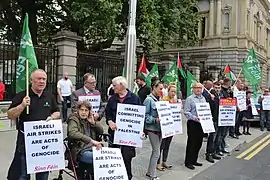 Les pro-palestiniens mettent en cause l'armée israélienne[47],[48] notamment à la suite de certaines exactions et massacres qui ont marqué l'histoire de l'armée, dont ceux de la guerre de 1948[49], de Qibya[50], de Kafr Qassem[51], de prisonniers de guerre[52],[53], de Sabra et Chatila[54], de Qana[55] ainsi que, à la suite d'opérations controversées, par exemple la bataille de Jénine[56], l'opération Plomb durci[57] ou l'abordage de la flottille pour Gaza[58]. Les pro-israéliens mettent en avant le « droit à l'auto-défense » d'Israël[59] et, dans ce contexte, l'armée israélienne serait la « plus morale du monde »[60] selon son application du précepte de la « Pureté des armes »[61].