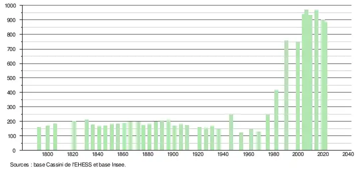 L'évolution du nombre d'habitants est connue à travers les recensements de la population effectués dans la commune depuis 1793. Pour les communes de moins de 10 000 habitants, une enquête de recensement portant sur toute la population est réalisée tous les cinq ans, les populations légales des années intermédiaires étant quant à elles estimées par interpolation ou extrapolation[33]. Pour la commune, le premier recensement exhaustif entrant dans le cadre du nouveau dispositif a été réalisé en 2004[34].
