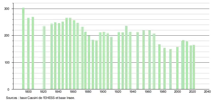 | L'évolution du nombre d'habitants est connue à travers les recensements de la population effectués dans la commune depuis 1793. Pour les communes de moins de 10 000 habitants, une enquête de recensement portant sur toute la population est réalisée tous les cinq ans, les populations légales des années intermédiaires étant quant à elles estimées par interpolation ou extrapolation[25]. Pour la commune, le premier recensement exhaustif entrant dans le cadre du nouveau dispositif a été réalisé en 2007[26]. En 2021, la commune comptait 165 habitants[Note 3], en diminution de 1,79 % par rapport à 2015 (Gironde : +6,88 %, France hors Mayotte : +1,84 %). |