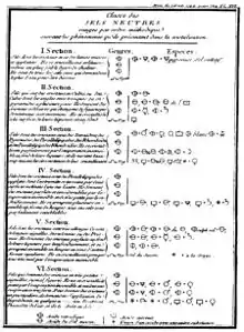 Classes des sels neutres[20]. Rouelle indique « je me suis servi d'une petite croix pour exprimer l'union d'un acide à une substance quelconque... »; cette petite croix est le même signe "+" utilisé de nos jours entre deux réactifs interagissant.