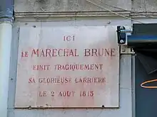 - L’hôtel du Palais-Royal (ancienne auberge du Palais-National) qui jouxtait le relais de poste. C’était le plus huppé d’Avignon. C'est là que, par deux fois, Bonaparte était descendu en 1778 et 1779, puis le pape Pie VII en 1809, mais c'est Stendhal qui le rend célèbre en 1837 dans ses Mémoires d’un touriste. A contrario, Alexandre Dumas, filleul du maréchal Brune, dans Les Compagnons de Jehu, brosse un portrait au vitriol de la cité papale où avait été assassiné son parrain !