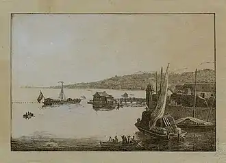 Une aquarelle ressemble beaucoup à cette ancienne gravure, on voit cependant à l’arrière-plan Ouchy et plus loin Lausanne[18].