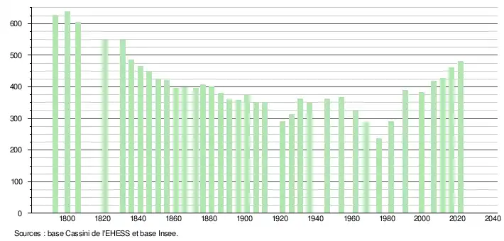 L'évolution du nombre d'habitants est connue à travers les recensements de la population effectués dans la commune depuis 1793. Pour les communes de moins de 10 000 habitants, une enquête de recensement portant sur toute la population est réalisée tous les cinq ans, les populations légales des années intermédiaires étant quant à elles estimées par interpolation ou extrapolation[20]. Pour la commune, le premier recensement exhaustif entrant dans le cadre du nouveau dispositif a été réalisé en 2006[21].