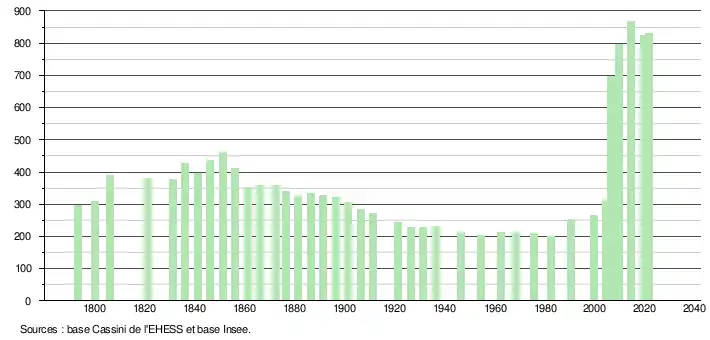 | L'évolution du nombre d'habitants est connue à travers les recensements de la population effectués dans la commune depuis 1793. Pour les communes de moins de 10 000 habitants, une enquête de recensement portant sur toute la population est réalisée tous les cinq ans, les populations légales des années intermédiaires étant quant à elles estimées par interpolation ou extrapolation[40]. Pour la commune, le premier recensement exhaustif entrant dans le cadre du nouveau dispositif a été réalisé en 2004[41]. En 2021, la commune comptait 829 habitants[Note 9], en diminution de 4,82 % par rapport à 2015 (Tarn : +1,82 %, France hors Mayotte : +1,84 %). |