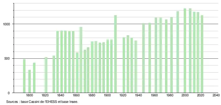L'évolution du nombre d'habitants est connue à travers les recensements de la population effectués dans la commune depuis 1793. Pour les communes de moins de 10 000 habitants, une enquête de recensement portant sur toute la population est réalisée tous les cinq ans, les populations légales des années intermédiaires étant quant à elles estimées par interpolation ou extrapolation[42]. Pour la commune, le premier recensement exhaustif entrant dans le cadre du nouveau dispositif a été réalisé en 2006[43].