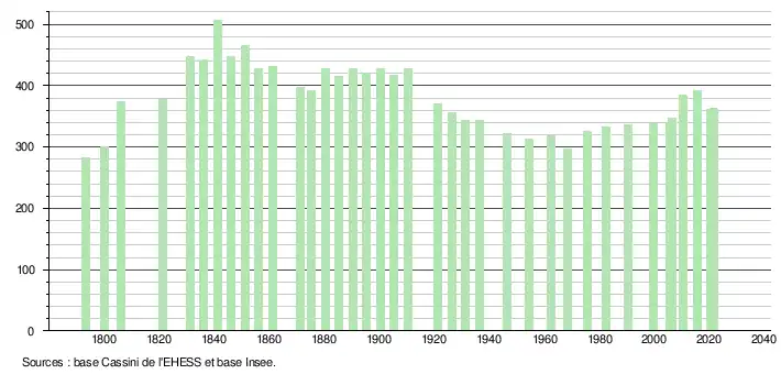 L'évolution du nombre d'habitants est connue à travers les recensements de la population effectués dans la commune depuis 1793. Pour les communes de moins de 10 000 habitants, une enquête de recensement portant sur toute la population est réalisée tous les cinq ans, les populations légales des années intermédiaires étant quant à elles estimées par interpolation ou extrapolation[19]. Pour la commune, le premier recensement exhaustif entrant dans le cadre du nouveau dispositif a été réalisé en 2005[20].