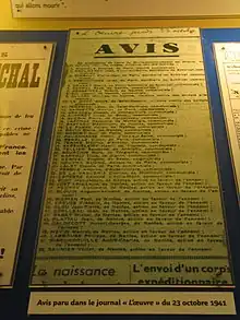 Muni de tous ces témoignages, Nordmann traverse la France pour aller rejoindre Louis Aragon qui avait perdu le contact avec le parti. Aragon rédige Le Témoin des martyrs, un opuscule de quelques pages publié clandestinement aux Éditions de Minuit en et qui fait rapidement le tour du monde. Il est lu à la radio de Londres par Maurice Schumann[84]. Il y met en exergue le député Charles Michels, les dirigeants de la CGT Jean-Pierre Timbaud et Jean Poulmarc'h mais plus encore que les autres, le lycéen Guy Môquet :