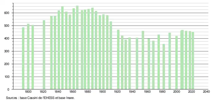 L'évolution du nombre d'habitants est connue à travers les recensements de la population effectués dans la commune depuis 1793. Pour les communes de moins de 10 000 habitants, une enquête de recensement portant sur toute la population est réalisée tous les cinq ans, les populations légales des années intermédiaires étant quant à elles estimées par interpolation ou extrapolation[19]. Pour la commune, le premier recensement exhaustif entrant dans le cadre du nouveau dispositif a été réalisé en 2007[20].