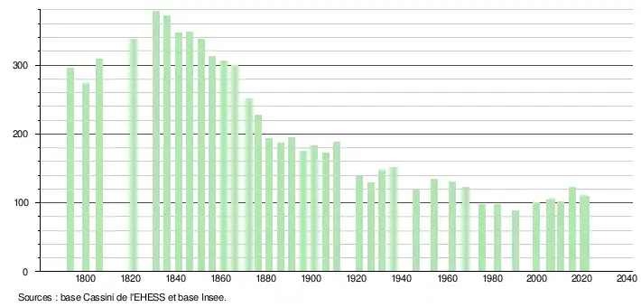 L'évolution du nombre d'habitants est connue à travers les recensements de la population effectués dans la commune depuis 1793. Pour les communes de moins de 10 000 habitants, une enquête de recensement portant sur toute la population est réalisée tous les cinq ans, les populations légales des années intermédiaires étant quant à elles estimées par interpolation ou extrapolation[22]. Pour la commune, le premier recensement exhaustif entrant dans le cadre du nouveau dispositif a été réalisé en 2005[23].