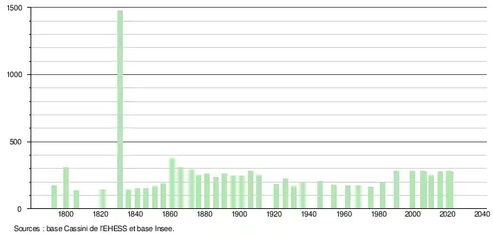 L'évolution du nombre d'habitants est connue à travers les recensements de la population effectués dans la commune depuis 1793. Pour les communes de moins de 10 000 habitants, une enquête de recensement portant sur toute la population est réalisée tous les cinq ans, les populations légales des années intermédiaires étant quant à elles estimées par interpolation ou extrapolation[26]. Pour la commune, le premier recensement exhaustif entrant dans le cadre du nouveau dispositif a été réalisé en 2005[27].